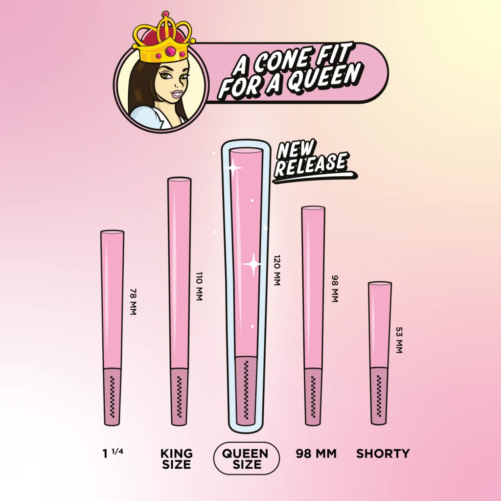Queen Sized Pre Rolled Cones – 25 Count | Our biggest cones yet are fit for a queen! Pack these 120mm cones with up to 2g of material easily. Whether you’re looking for something big  to share with friends or a challenge all for yourself, these Queen Size Cones are going to be your new go-to.