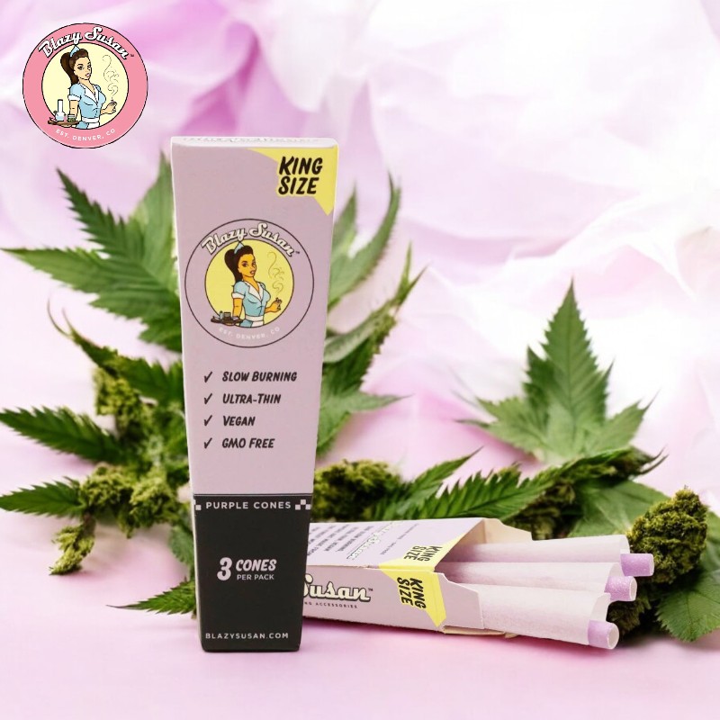 These Blazy Susan Purple King Size Pre-rolled Cones are a must-have for any smoker. With their vibrant purple color, they make a statement every time you smoke. Made with French-made rolling papers of the highest quality, these pre-rolled cones are designed to burn slowly with no aftertaste — just pure flavor that will keep you enjoying your smoking experience. Each pack comes with three king size cones for your convenience, so you can enjoy a smooth puff wherever you go! Blazy Susan takes smoking to the next level, making it easier and more enjoyable than ever before. Pick up a pack today and see why Blazy Susan has become the go-to choice for connoisseurs around the world!