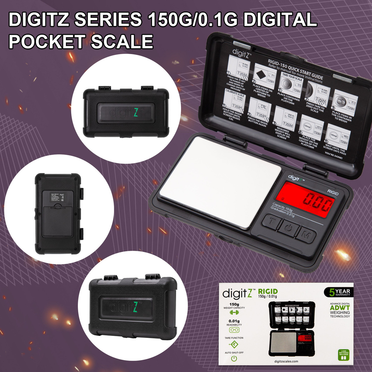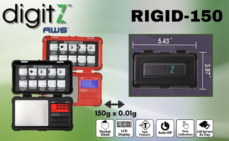 DigitZ digital RIGID is durable and rugged. It features a mode button that switches unit modes between grams, ounces, carats, grains, troy ounces, and pennyweights. Use the Tare button for quick and easy taring. The backlit LCD helps make the numbers viewable and easy to read, even in dim lighting. The stainless-steel surface is easy to clean. Place your items directly onto the platform or place them in a tray/container for measuring.