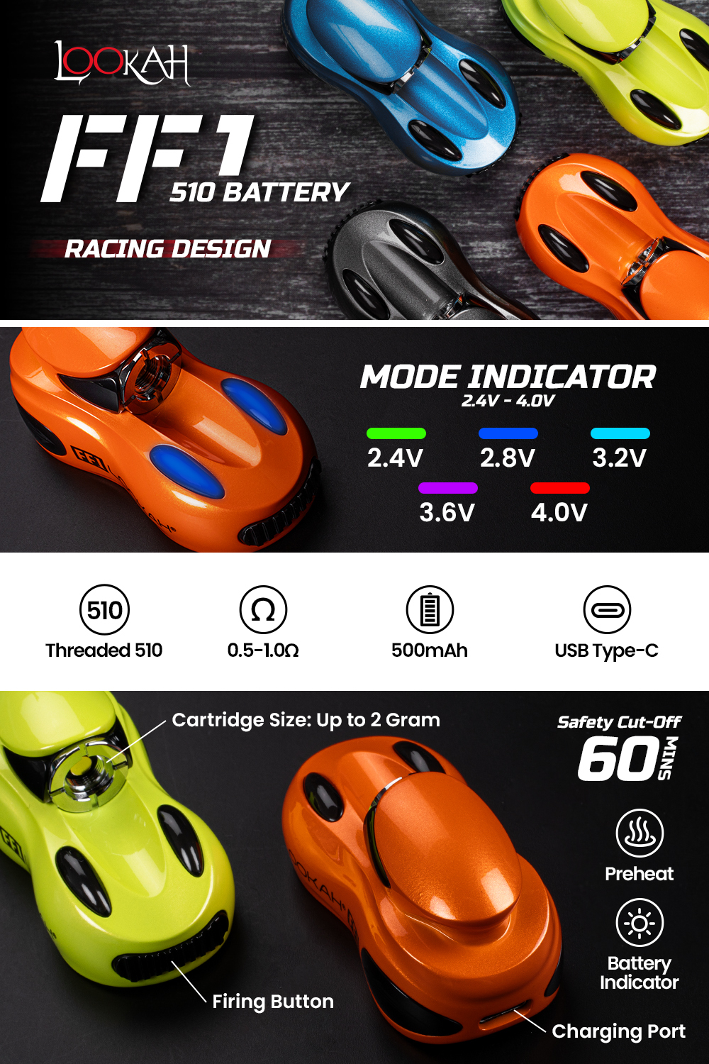 The Lookah FF1 510 Thread Battery is an exceptional choice for vapers seeking portability, power, and precision voltage control. Designed with a sleek race car-inspired body, this compact 510-thread vape pen battery blends style and functionality, making it an eye-catching addition to any collection.