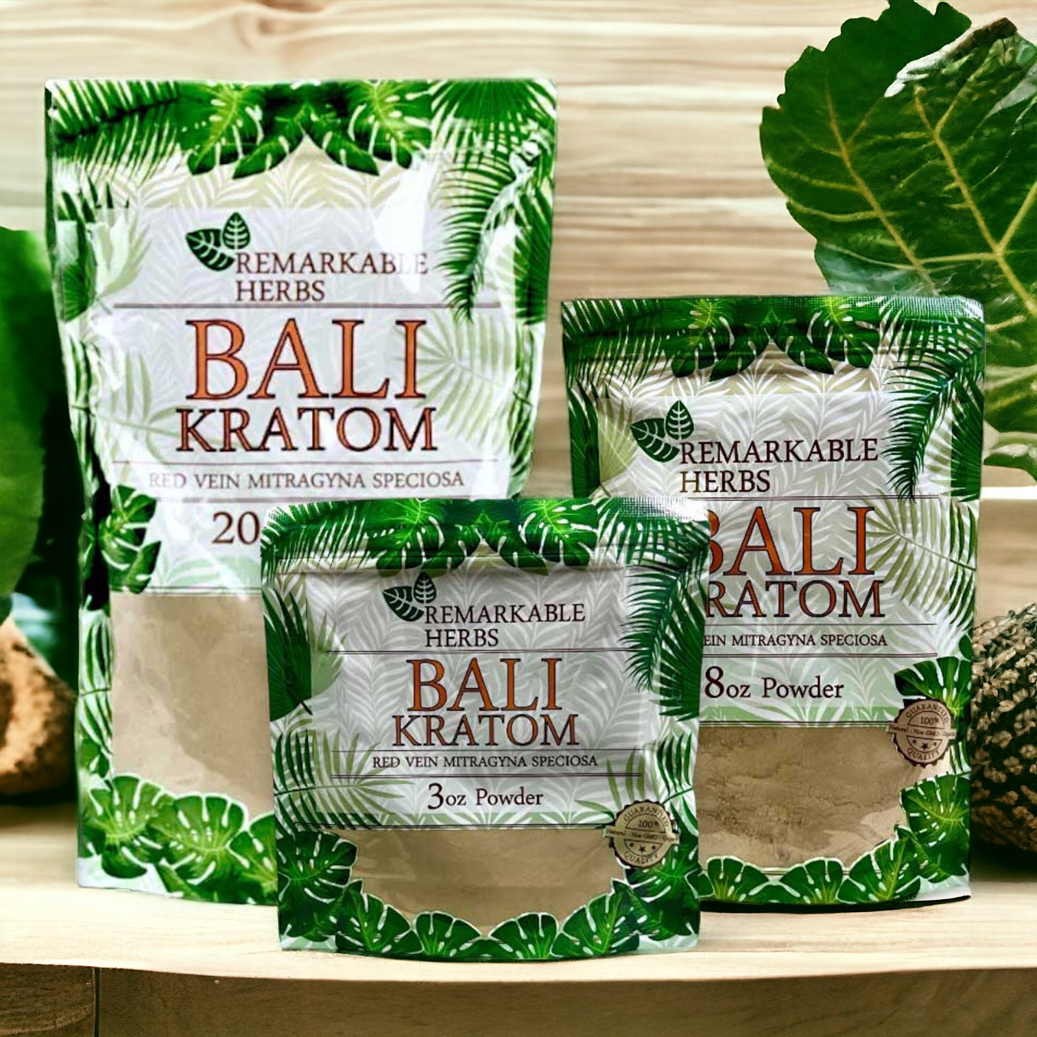 An exclusive Red Bali kratom powder blend of 100% pure Mitragyna Speciosa by Remarkable Herbs. Red vein kratom powder that energizes like green but has the same body relaxing effects that red kratom is known for. Remarkable Herbs is all about the Herbs.