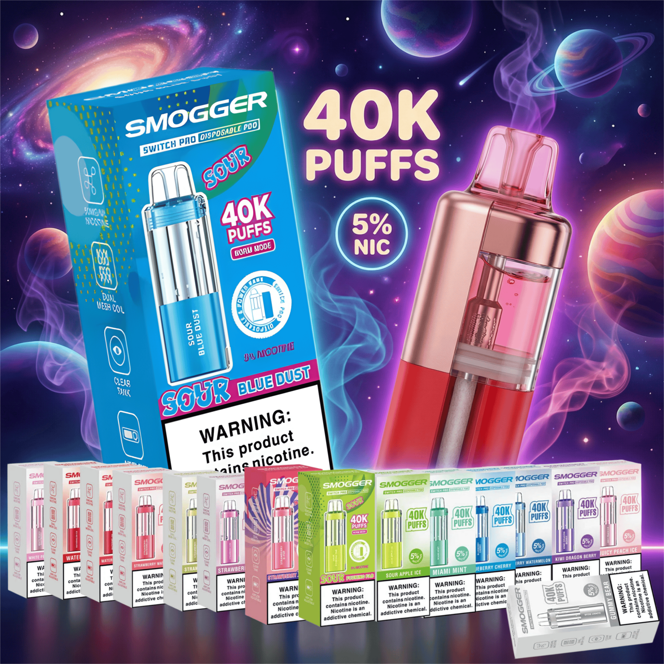 Experience convenience and longevity with the Smogger Switch Pro disposable vape pods. It contains a built-in 200mAh battery with up to 40,000 puffs in NORMAL mode, or 20,000 puffs in BOOST mode. When attached to a 850mAh Smogger Switch Pro 40K Battery Kit, the total capacity is 1050mAh for extended battery life on the go. Swap out your favorite pre-filled 19mL e-liquid replacement pods easily. The Switch Pro 40K disposable pods from Smogger is available in 5% nicotine strength and is eco-friendly for all your vaping needs.