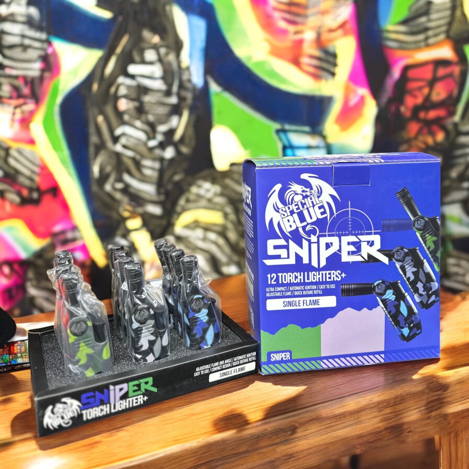 The Special Blue Sniper Torch Lighters come in a 12-count display. With their adjustable angle nozzle they offer a perfect blend of durability and convenience. These compact lighters are designed for reliability and ease of use, making them ideal for various lighting needs. Each Sniper Torch lighter is crafted to deliver a precise and strong flame, ensuring efficient performance every time.