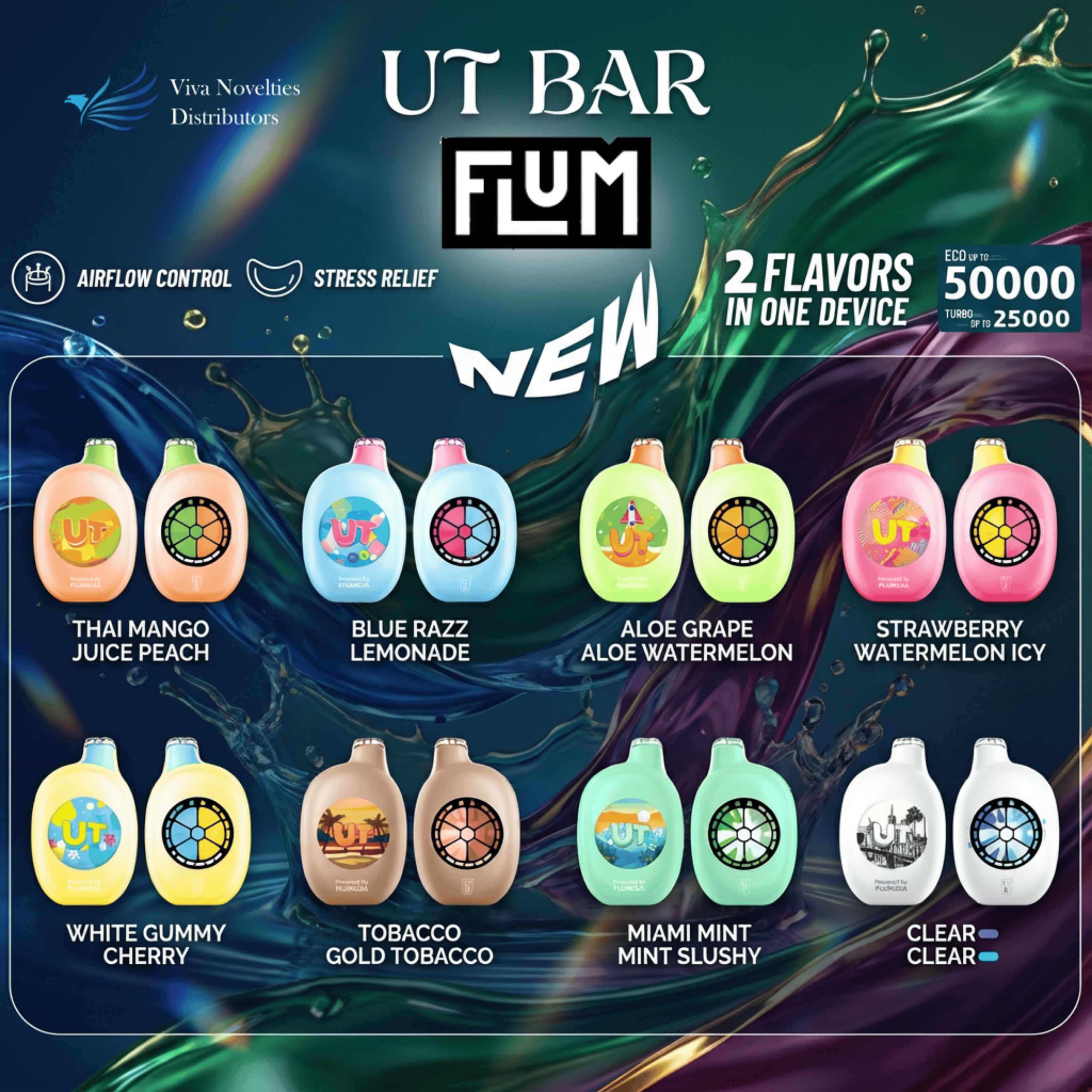 UT Bar 50000 Puffs Disposable Vape is the first 50k disposable vape developed by Flum, and each of them carries two different flavors in one vape. With the dual tank design, Flum UT Bar carries two types of e-juice and allows you to switch between two flavors with ease. There are also two output modes (Eco and Turbo Modes). You can either enjoy more puffs with the Eco mode or enhance the flavor to a new level with the turbo and finish as many as around 25000 puffs. You can also squish the Flum UT Bar 50K to relieve your stress as well.